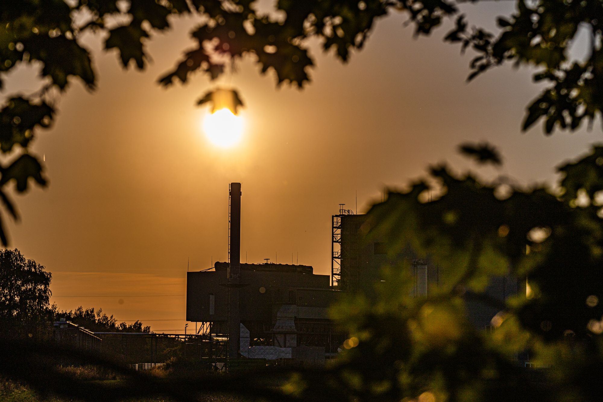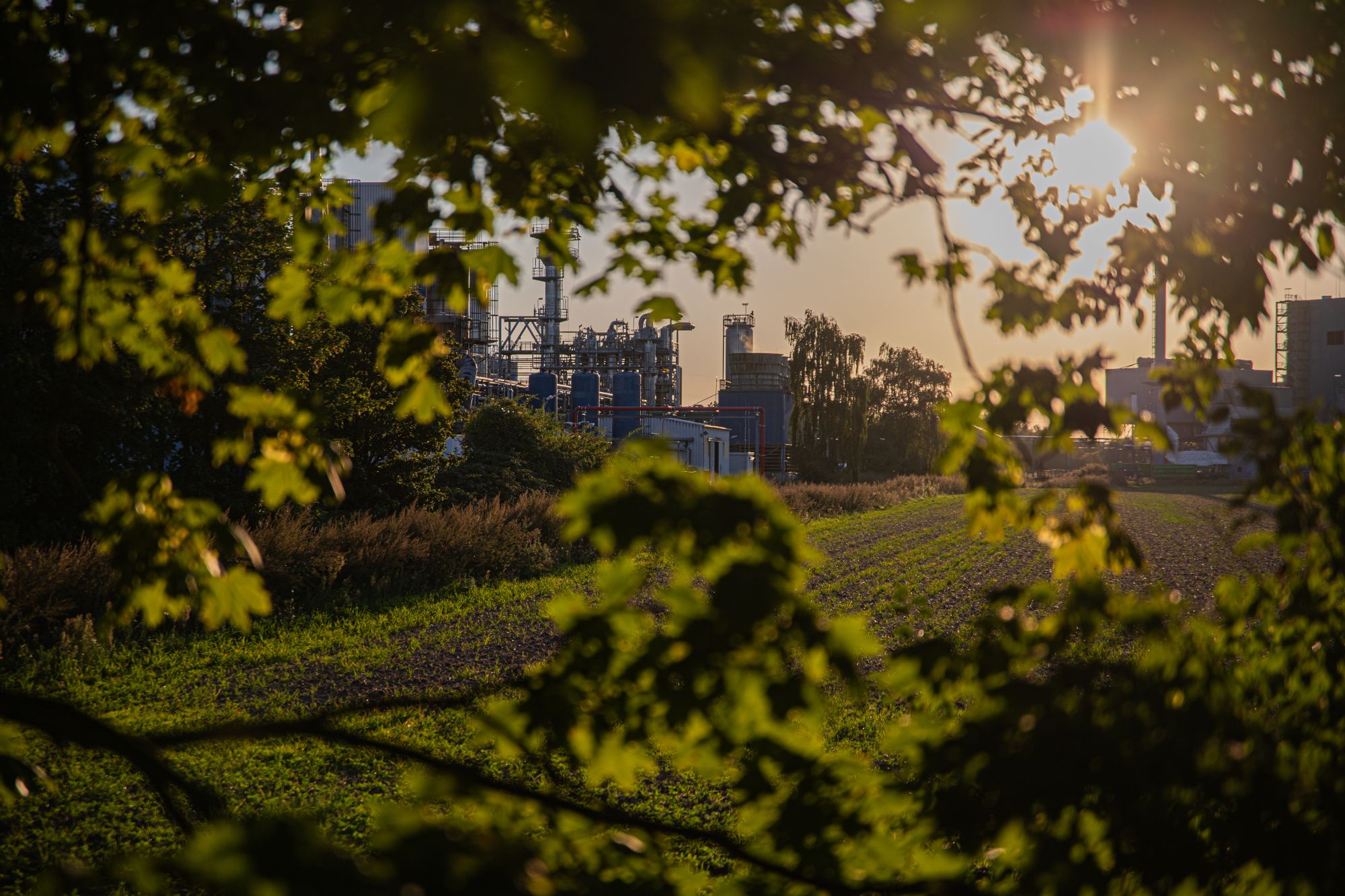 Raffinerie im Gegenlicht im Blätterrahmen