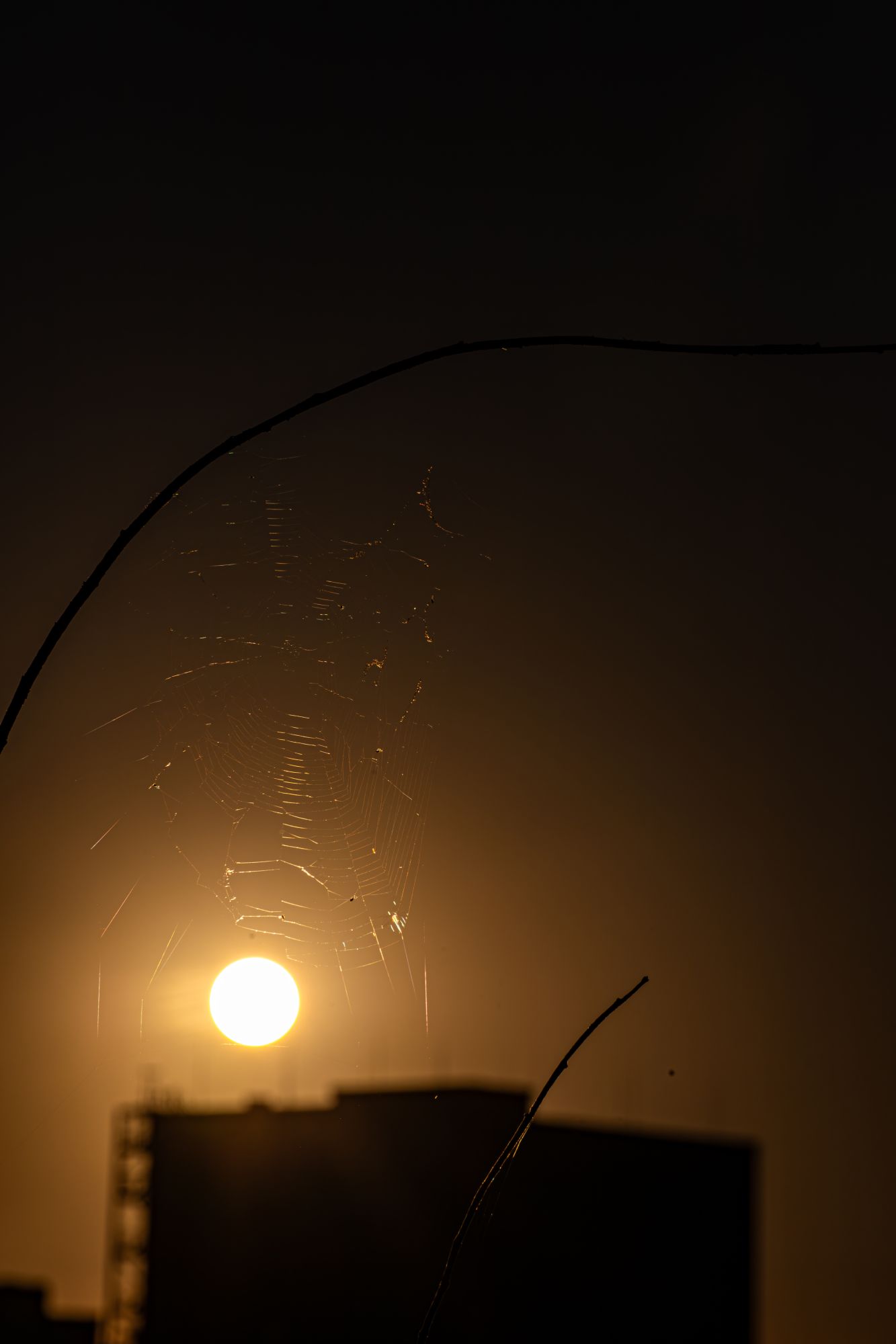 Raffinerie und Spinnennetz im Gegenlicht